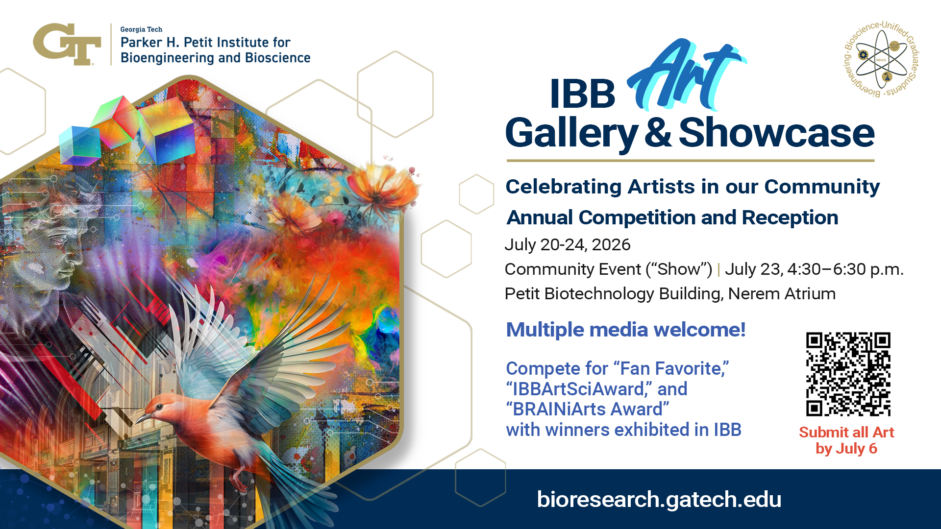 Selected pieces will be exhibited for five days, July 20–24, with a community‑wide celebration on July 23. Submissions are welcome across multiple mediums and themes, and award‑winning artwork will be displayed in IBB’s Nerem Atrium and on the IBB website. All GT community members are encouraged to participate.