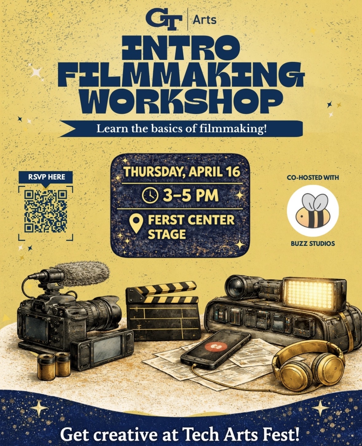 Join GT Arts on Thursday, April 16, from 3–5 PM on the Ferst Center Stage for an Intro to Filmmaking Workshop, part of Tech Arts Fest.