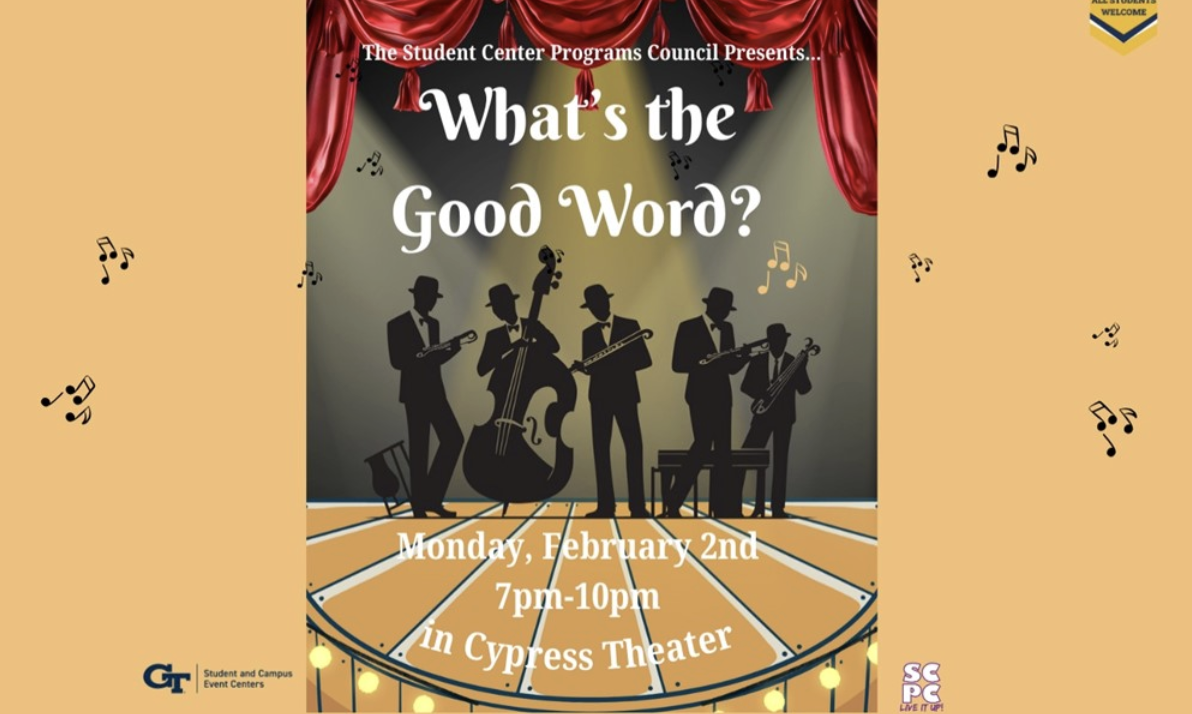 Join the Student Center Programs Council on Monday, February 2, from 7:00–10:00 PM at the Cypress Theater for What’s the Good Word?, a jazz-inspired trivia night focused on connection and comfort rather than competition.