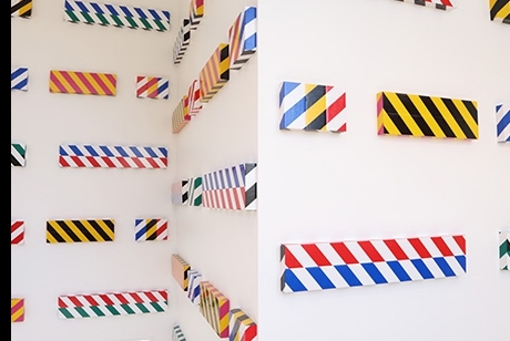 “OSHA/ANSI no. 15: Safety Tape on Panel” presents a series of 71 multi-colored panels depicting safety tape patterns, which snake around the building’s brightly lit lobby walls. The vivid pop of colors and patterns create an inviting atmosphere that also highlights the Office of Sustainability, Facilities, and Safety’s commitment to ensuring safety in workspaces and activities across the Institute.