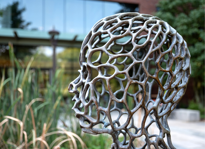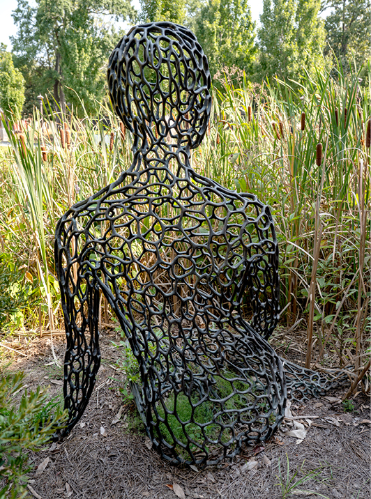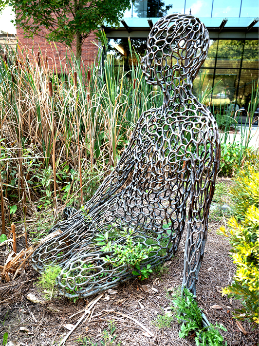 Poly is a seated female figure in organic cellular bronze lattice. It was installed with Because of You (Josh Garber) and Without Within (Robert Winkler) as part of Art at the Engineering Biosystems Building.