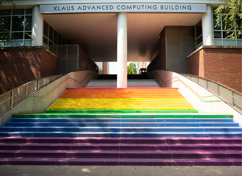 The Progress Pride Staircase at the Klaus Advanced Computing Building was introduced to campus at an unveiling ceremony that took place on July 22, 2021. Lisa Medford, a public policy major and president of Pride Alliance, led the staircase project, which was created by the artist, Ting, a Georgia Tech alumni.