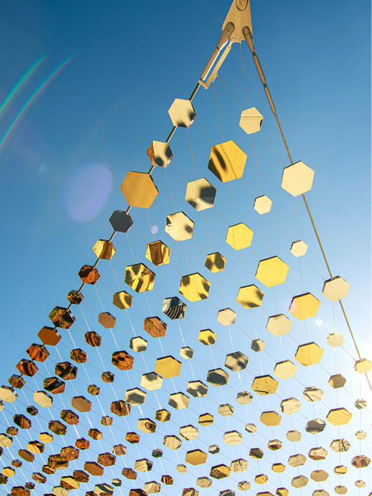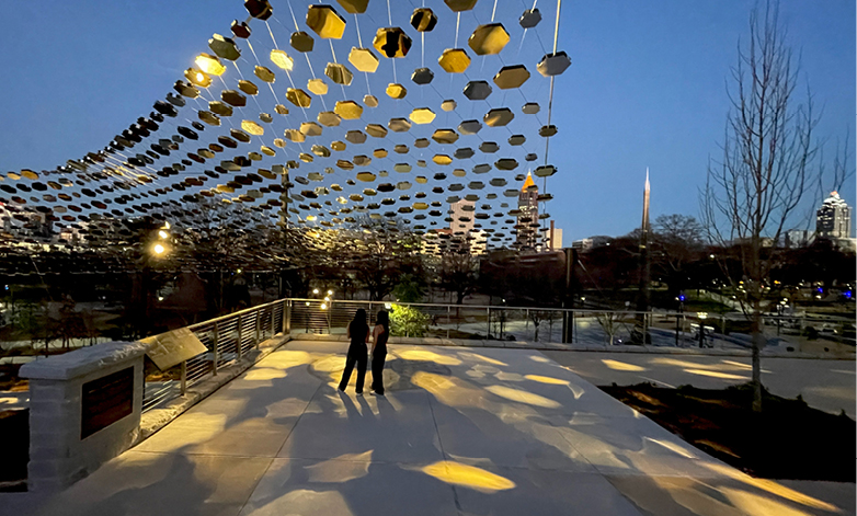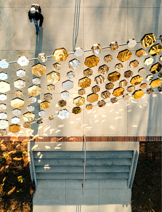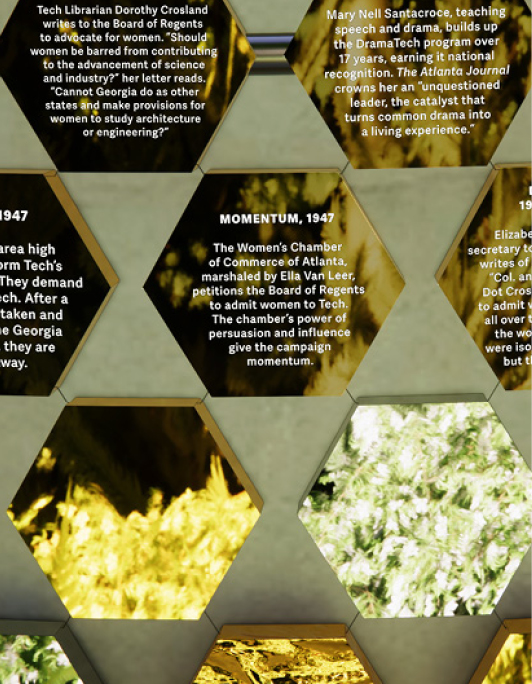 The structure contains nearly 3,000 mirrored tiles, each of which tell the story of Tech alumnae, students, faculty, and staff who made a lasting impact — at the Institute, in their field, and in the world. It informs, inspires, and celebrates decades of Georgia Tech women’s achievements.