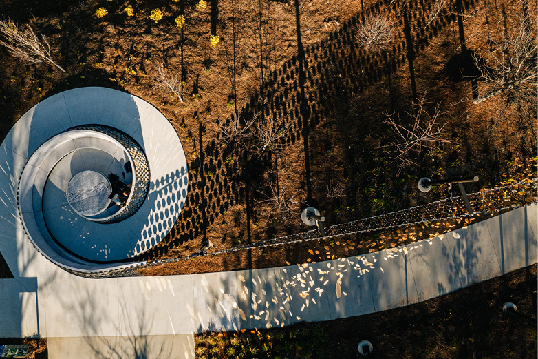 The inscribed mosaic fabric stretches across the site in three areas, beginning wrapped around a spiral contemplative bench dedicated to the history of women at Tech. Emerging from the ground, it spans across the site and main pedestrian spine, presenting the voices of women from Tech — graduates who have made a significant impact in their field since leaving campus. And as the tribute reaches above the John Lewis Student Center, it inspires visions for future Georgia Tech women.