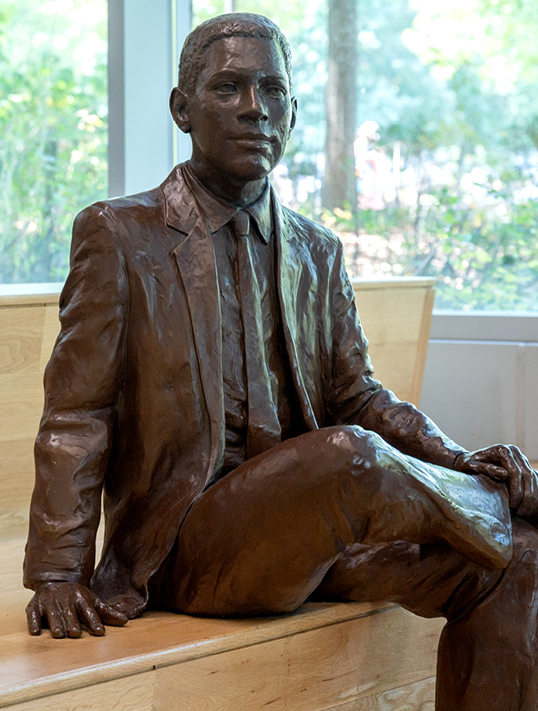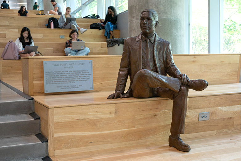Ronald L. Yancey, EE 1965, was the first African American to graduate from the Georgia Institute of Technology. Georgia Tech was the first college in the deep South to peacefully and successfully integrate without a court order. This significant event is commemorated through the generosity of Betsy and Bo Godbold, IE 1965. The First Graduate sits on the interior steps of Clough Undergraduate Commons.